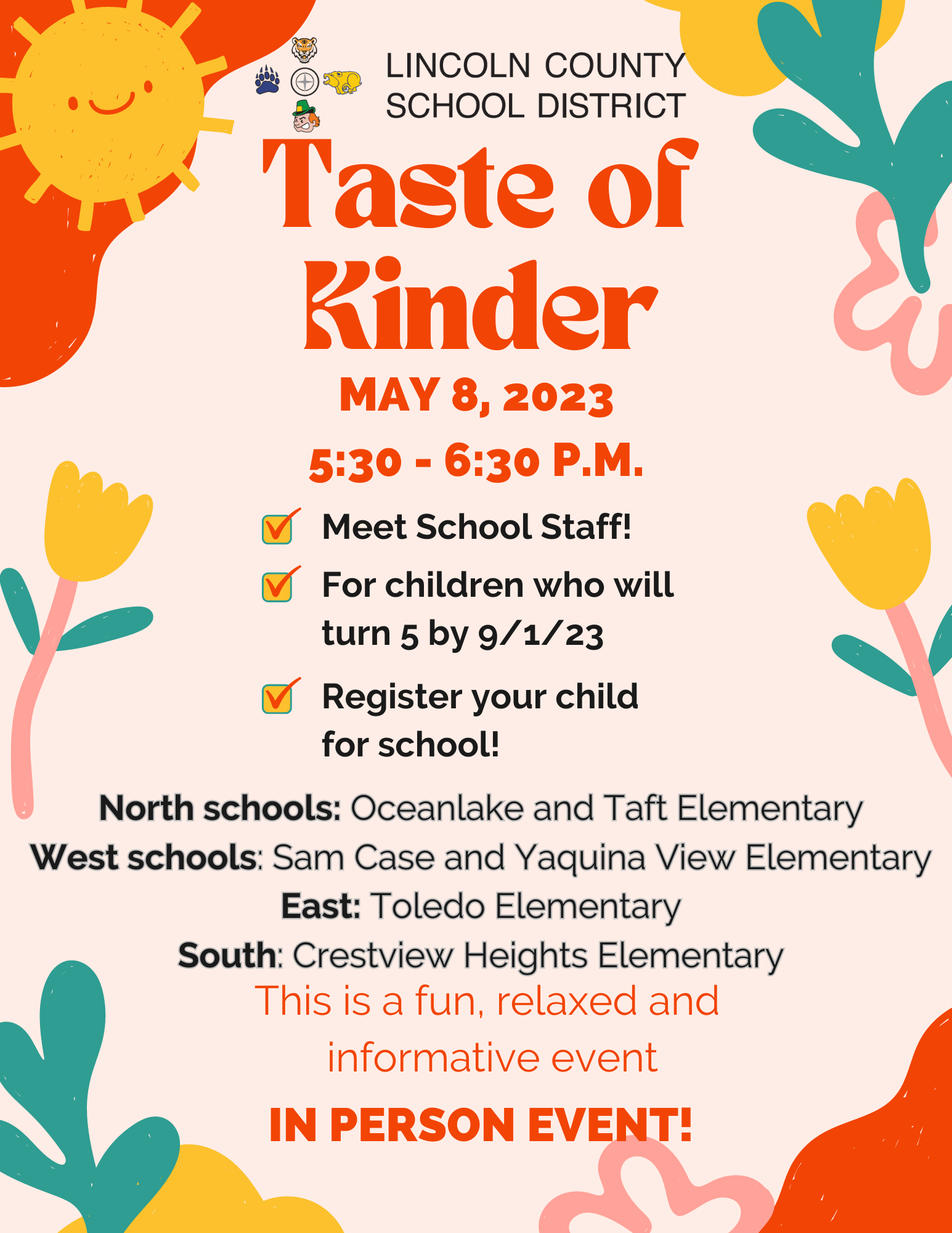 All four Lincoln County School District elementary schools will be hosting “A Taste of Kindergarten” open house for families on May 8 from 5:30 – 6:30 p.m.! If you have a child that will be 5 years old by September 5, 2023, please plan to attend your school’s event. It is a fun, relaxed and informative “taste” to get acquainted with teachers, sample some food from the school menu, find a bus, register for school, and explore the playground! Each kindergartner will receive a free gift-bag. We hope to see you there!