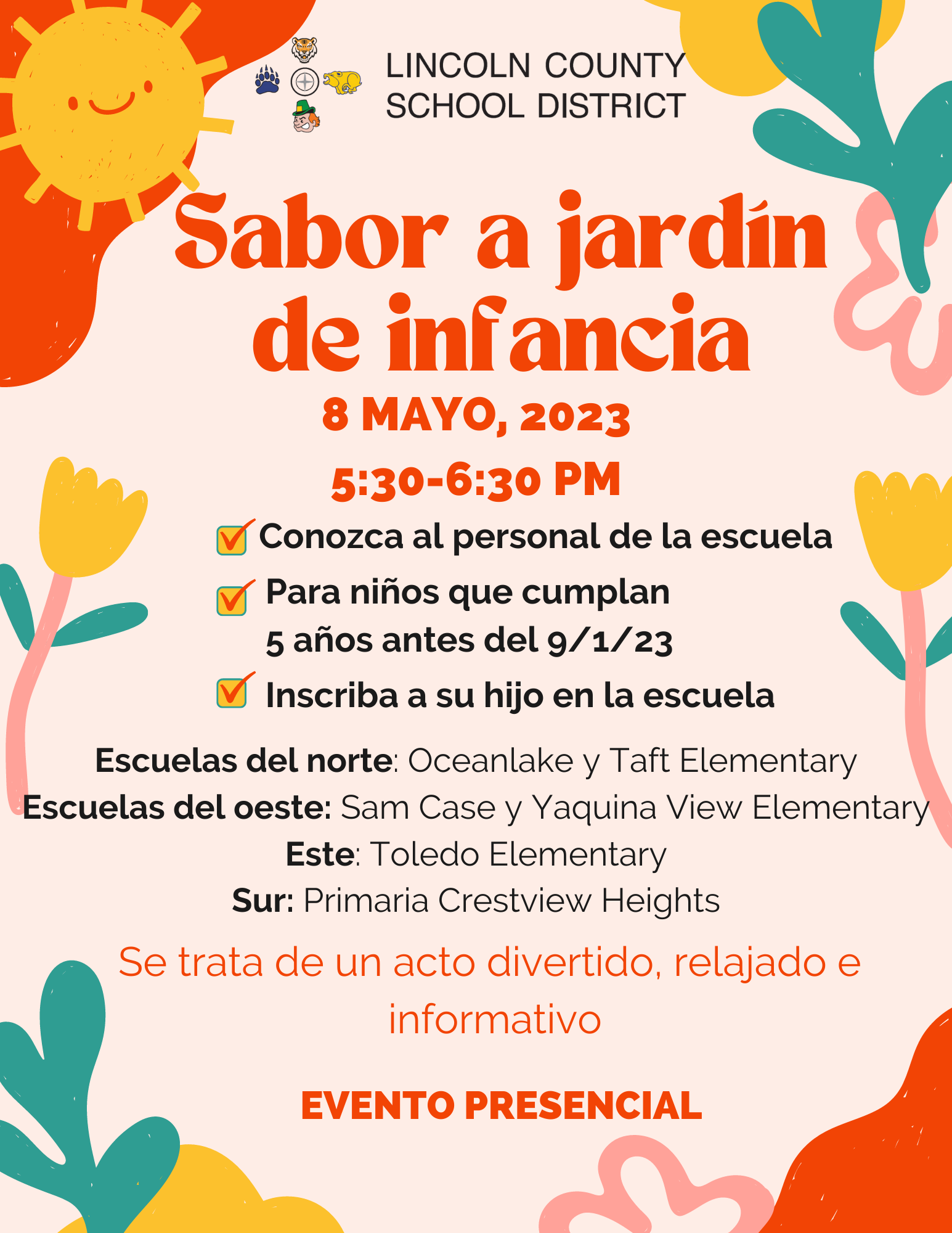 ¡Las cuatro escuelas primarias del Distrito Escolar del Condado de Lincoln serán anfitrionas de “A Taste of Kindergarten” en persona el 8 de mayo de 5:30 – 6:30 p.m.! Si usted tiene un niño que tendrá 5 años el 5 de septiembre de 2023, por favor planee asistir al evento de su escuela. Es una “degustación” divertida, relajada e informativa para conocer a los maestros, probar algunos alimentos del menú escolar, encontrar un autobús, inscribirse en la escuela y ¡explorar el patio de recreo! Cada niño recibirá una bolsa de regalo. ¡Esperamos verles allí!